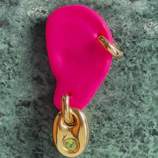 Earring set featuring a pendant made from 925 sterling silver plated in 3-micron 18kt gold vermeil and a natural peridot gemstone. Hoops are 925 sterling silver plated in 3-micron 18kt gold vermeil.